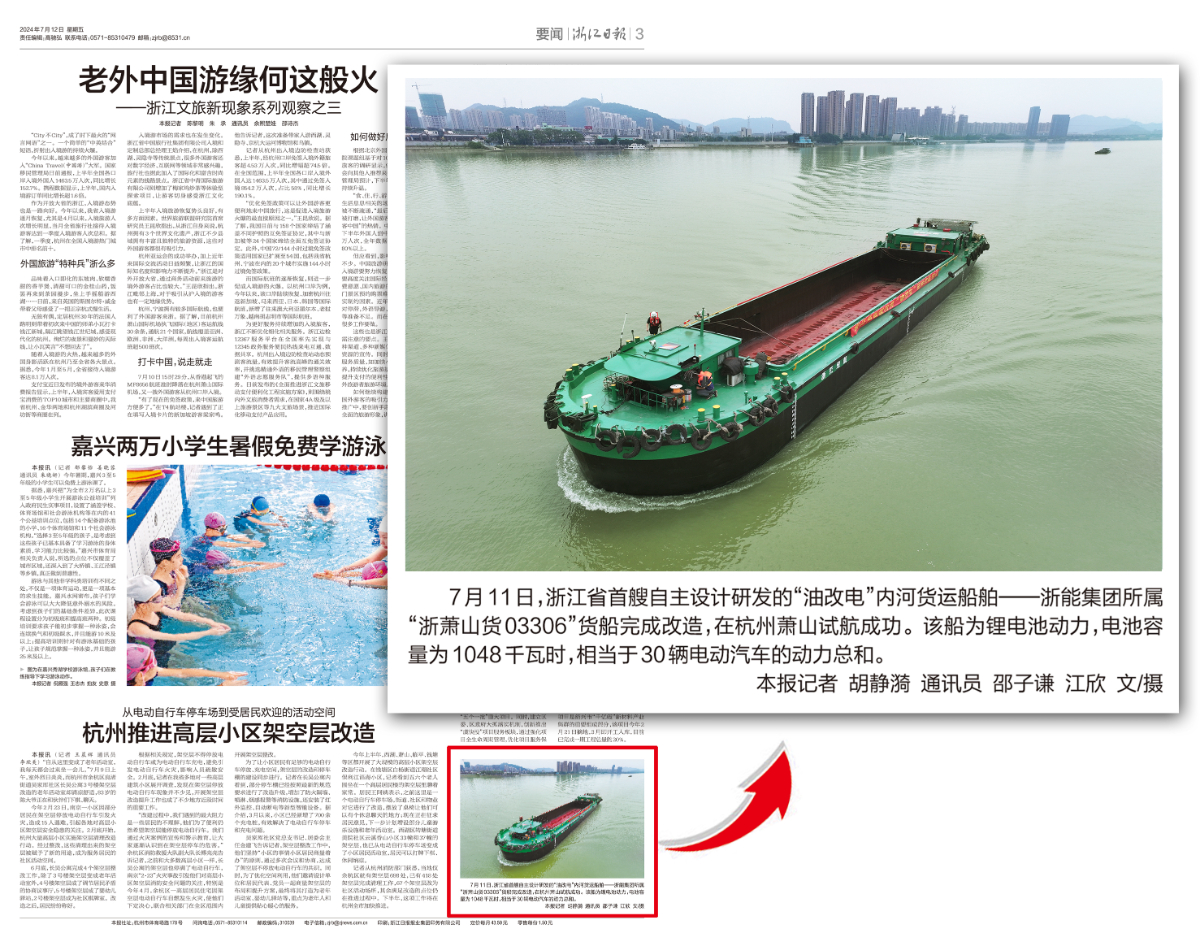 7月(yue)12日(ri),《浙(zhe)(zhe)江(jiang)日(ri)報》報道:浙(zhe)(zhe)江(jiang)省首艘自主設(she)計研發(fa)的“油改電”內河貨運船舶——浙(zhe)(zhe)能(neng)集團所屬“浙(zhe)(zhe)蕭山貨03306”貨船完成(cheng)改造(zao),在(zai)杭州蕭山試航成(cheng)功。 浙(zhe)(zhe)江(jiang)日(ri)報 圖