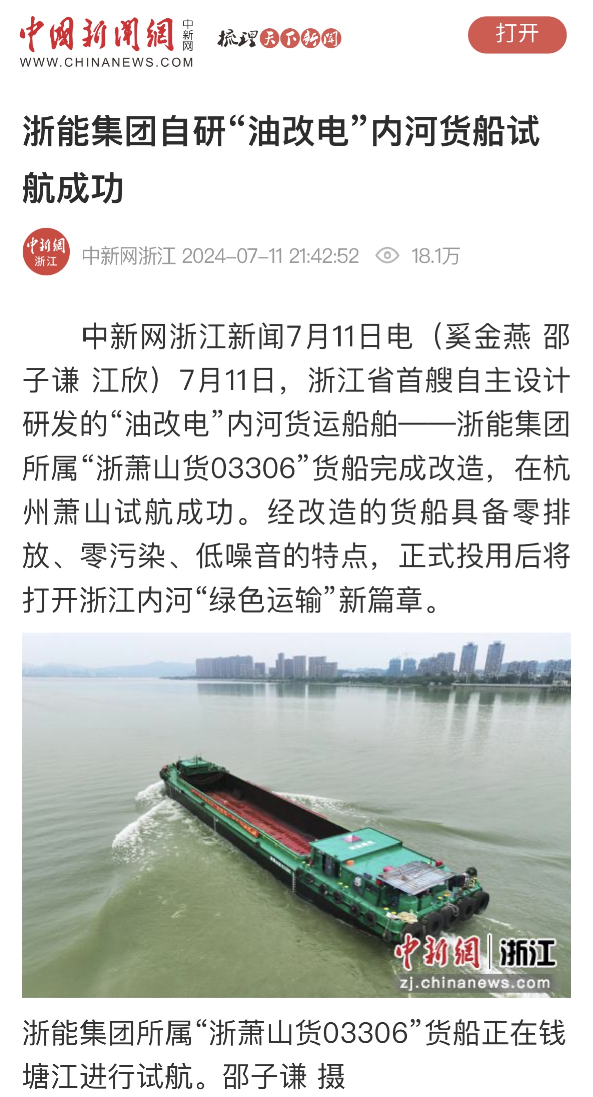 7月(yue)11日,中國新聞網報(bao)道《浙(zhe)能集團(tuan)自研(yan)“油改電”內河貨(huo)船試航(hang)成功》。 中國新聞網 圖