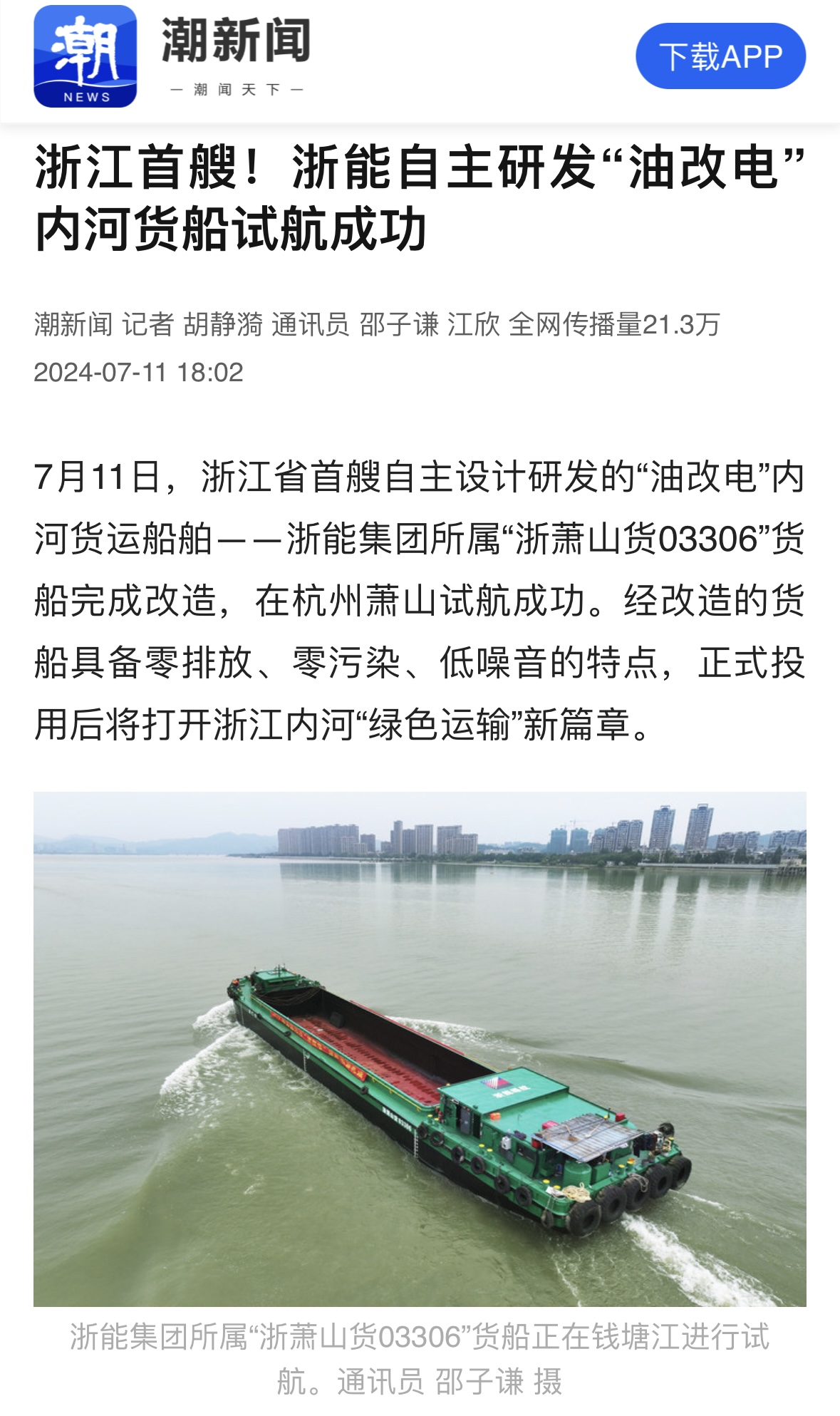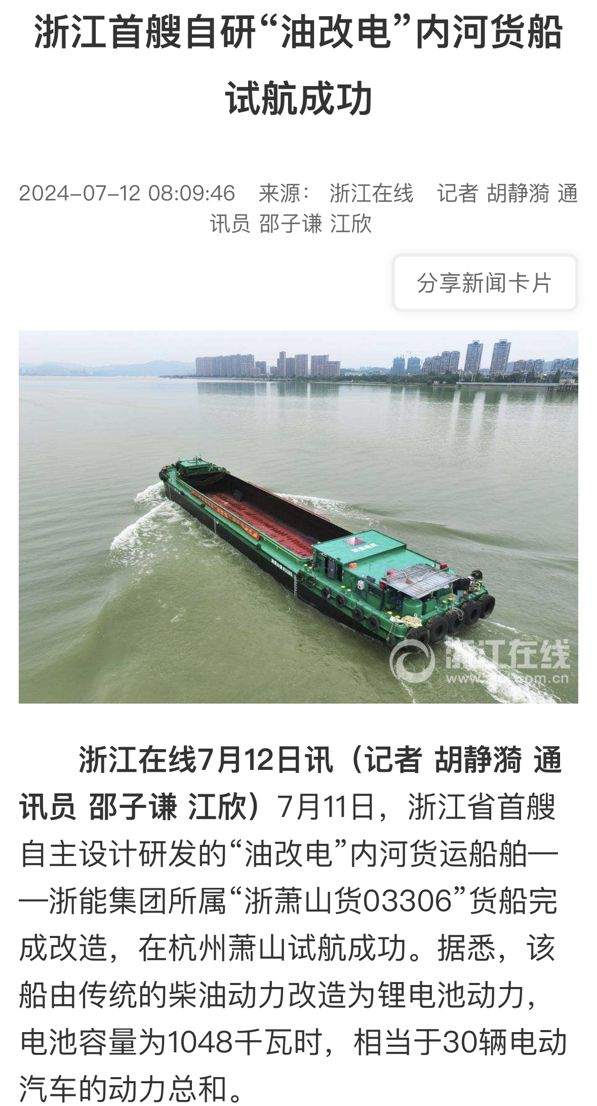 7月(yue)12日,浙(zhe)江在(zai)線公眾號報道(dao)《浙(zhe)能集團(tuan)自研“油改電(dian)”內河貨船試(shi)航成功》。 浙(zhe)江在(zai)線 圖