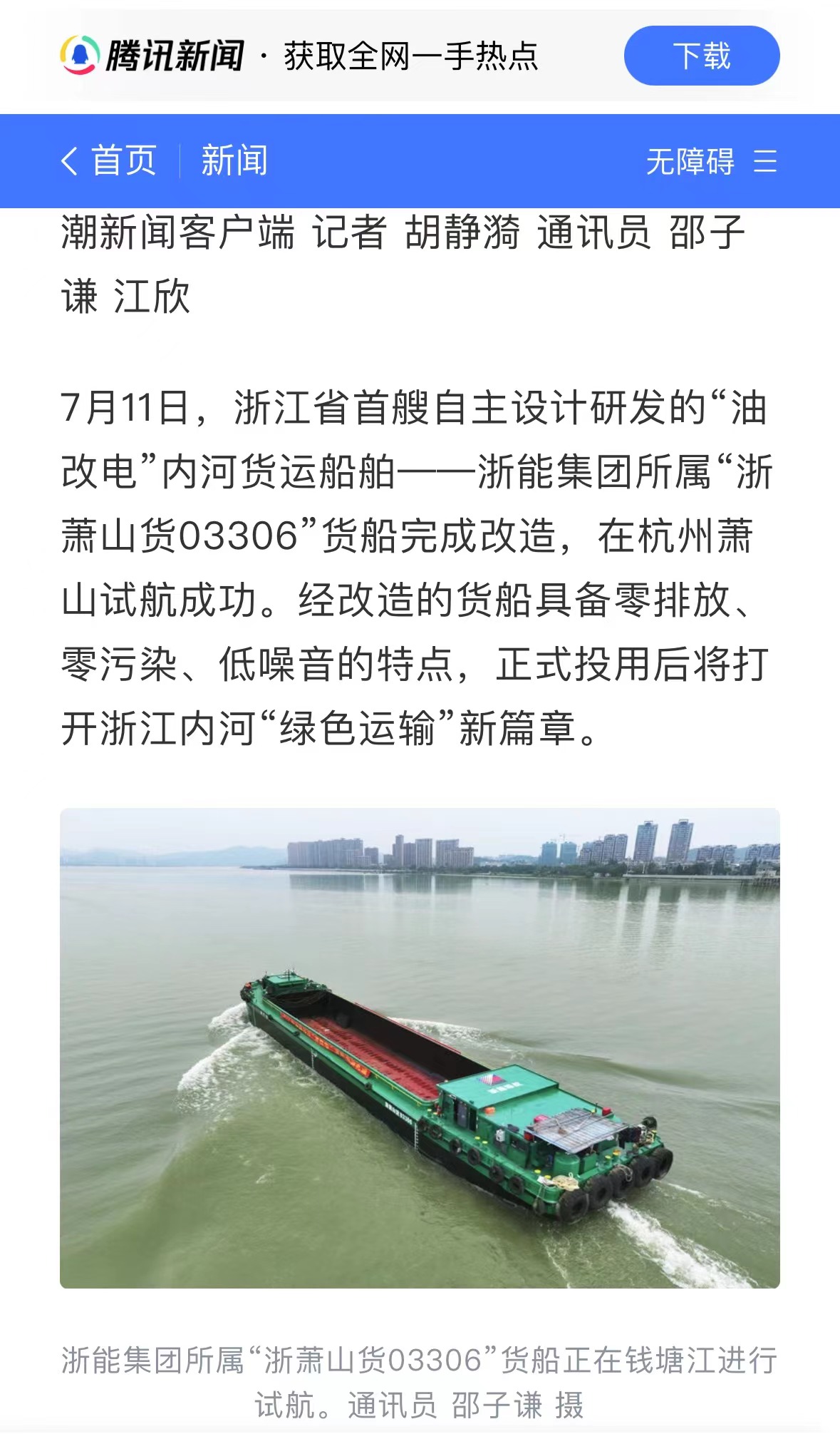 7月11日,騰(teng)訊新聞報道(dao)《浙能集團自研“油改電”內河貨船試(shi)航成功(gong)》。 騰(teng)訊新聞 圖(tu)