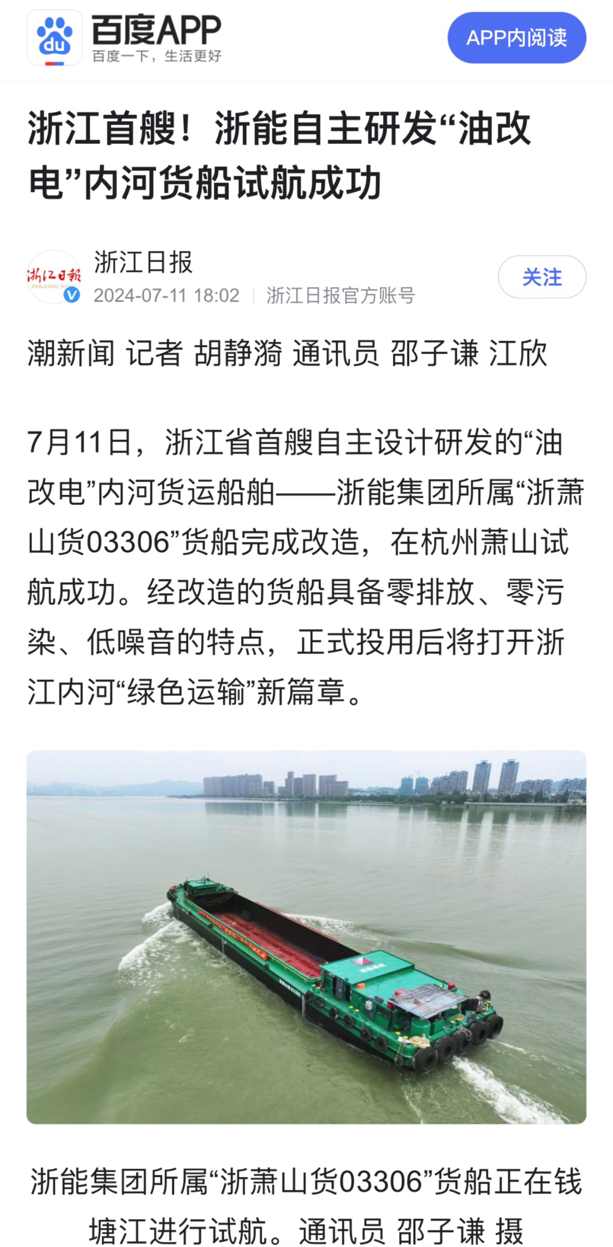 7月11日,百度(du)報道《浙(zhe)能集團自(zi)研“油改電”內河貨船試航(hang)成功(gong)》。 百度(du) 圖(tu)