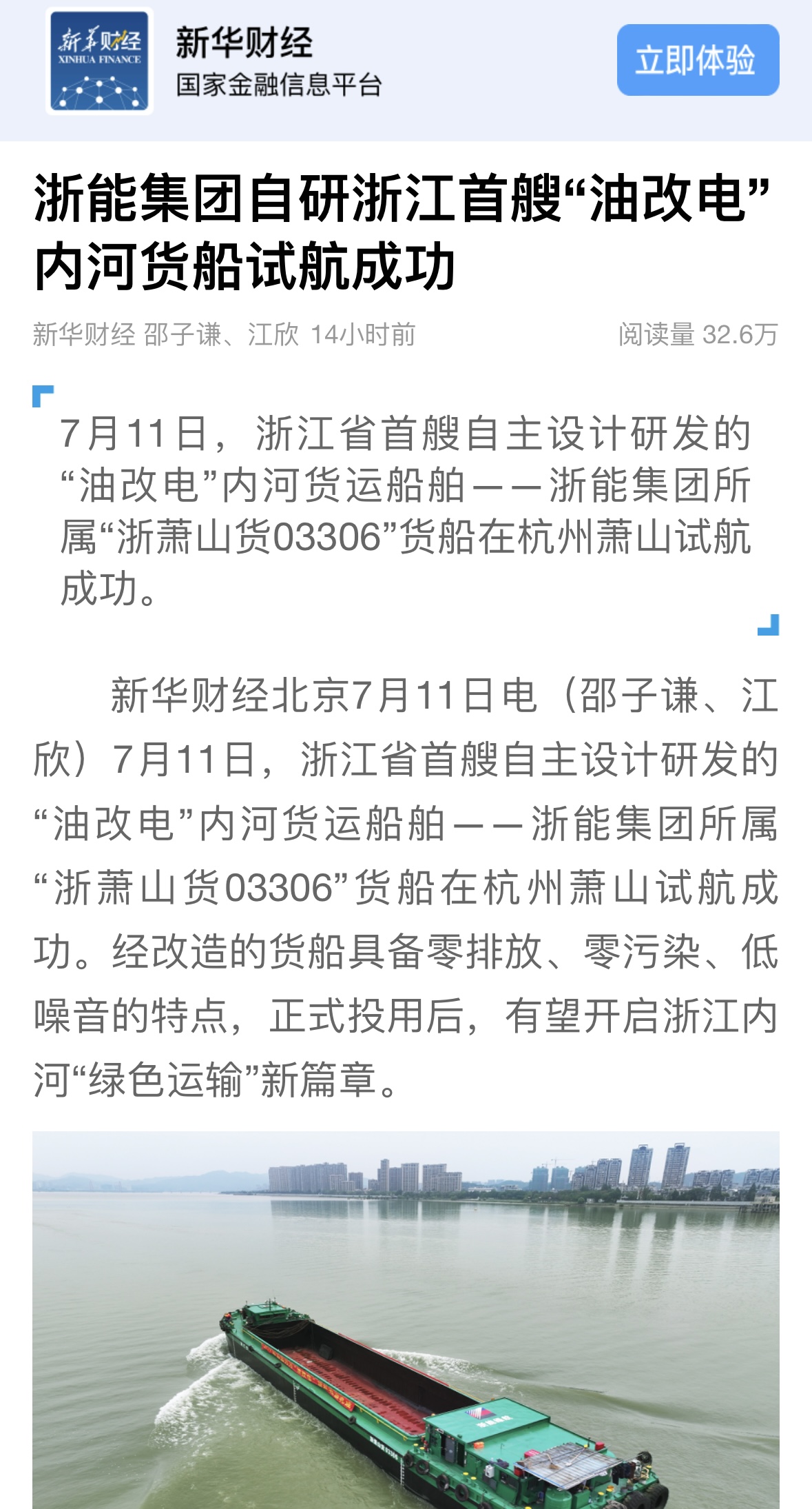 7月12日,新(xin)浪(lang)財經轉(zhuan)載(zai)報道《浙能(neng)集團(tuan)自研(yan)“油(you)改(gai)電”內河貨(huo)船試航成功》。 新(xin)浪(lang)財經 圖
