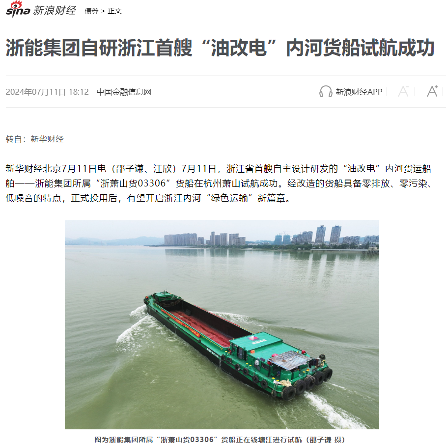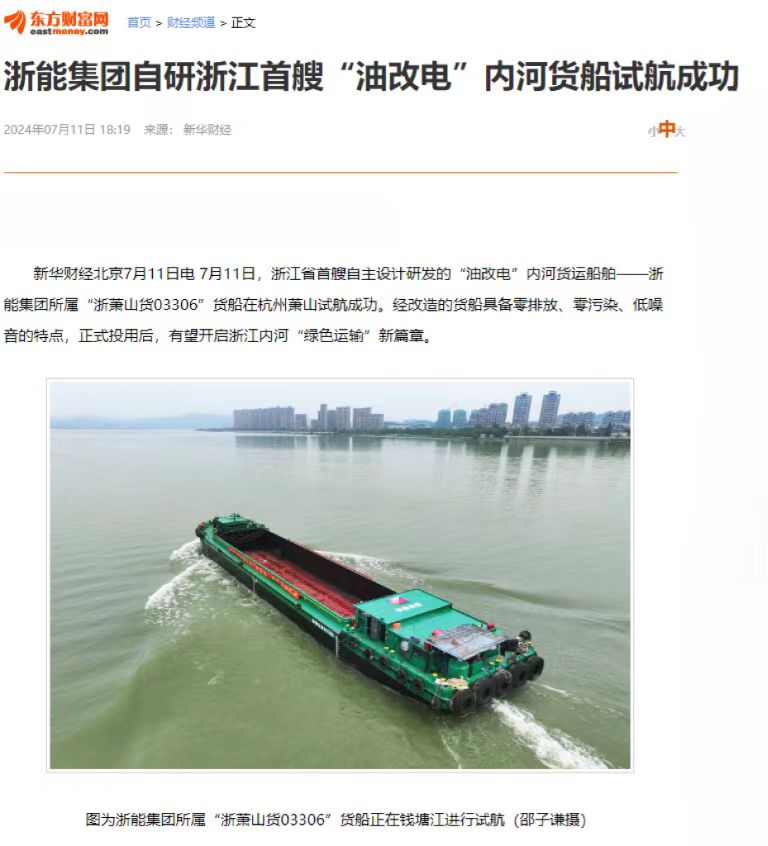 7月12日,東方(fang)財富網報道《浙能集團自(zi)研“油(you)改電”內河貨船試(shi)航成(cheng)功》。 東方(fang)財富網 圖(tu)