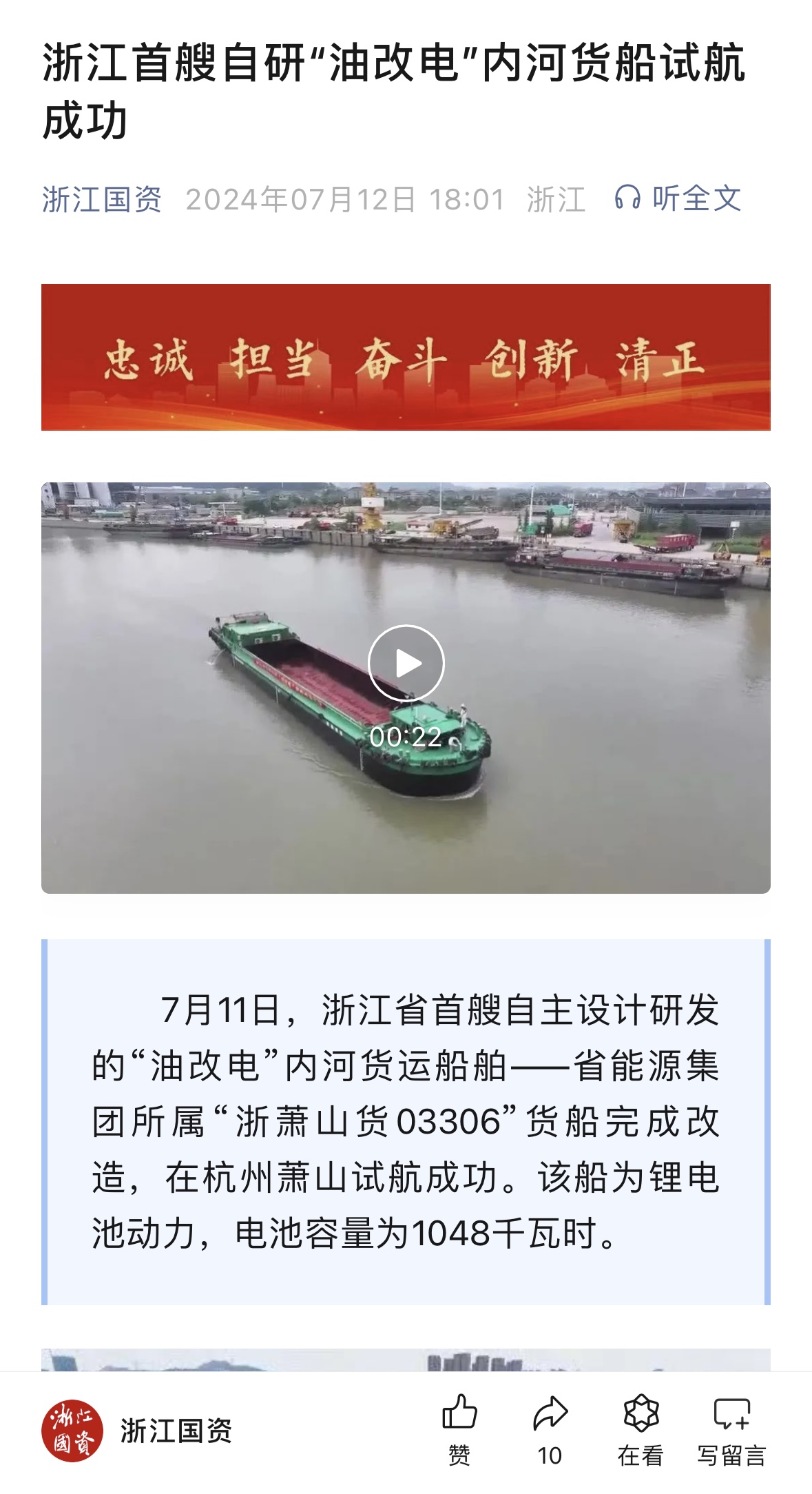 7月12日(ri),浙江國資公眾號報道《浙能集團自研(yan)“油改電”內河(he)貨船試航成功》。 浙江國資 圖