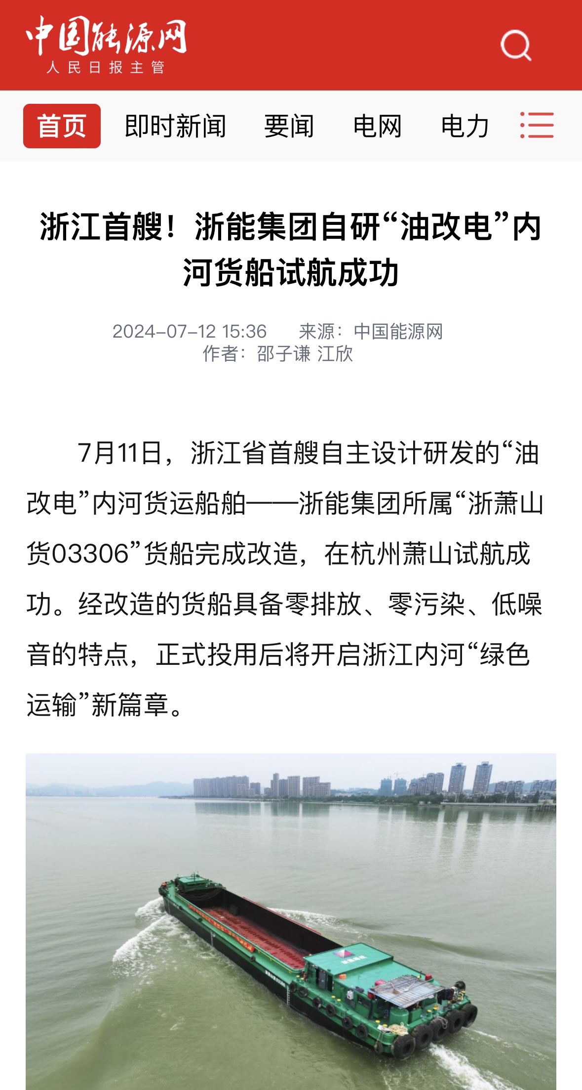 7月12日(ri),中國能源(yuan)網報道《浙(zhe)能集團自(zi)研“油改電”內河貨船試航成功》。 中國能源(yuan)網 圖