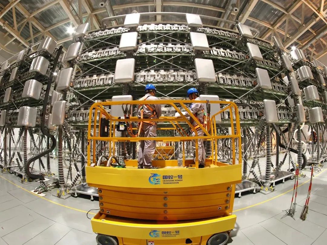 舟(zhou)山五(wu)端柔性(xing)直流輸(shu)電工程,國網舟(zhou)山供(gong)電公司電力工人進行(xing)柔直換流站閥廳(ting)子模塊調試。