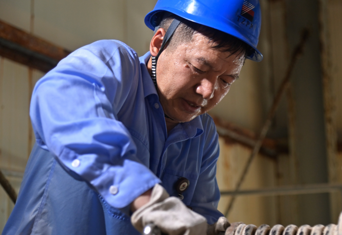 臺電維(wei)護部(bu)環保班(ban)班(ban)長(chang)任呂華在悶熱(re)潮濕環境中檢修石膏脫水設備。 崔(cui)雪(xue) 攝