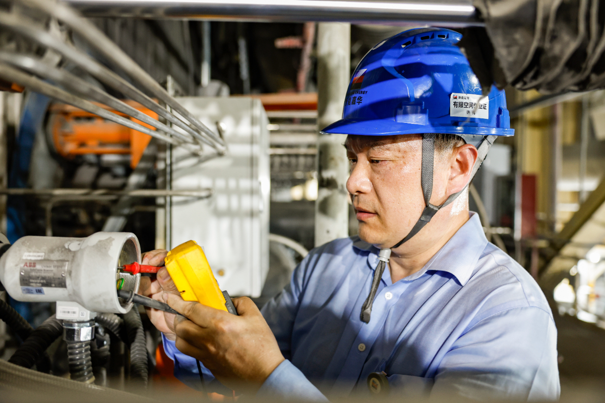 浙(zhe)能集團嘉(jia)興發電廠(chang)儀控一(yi)班工作人員(yuan)正冒(mao)著高溫進(jin)行設備消缺工作。 王重陽 攝