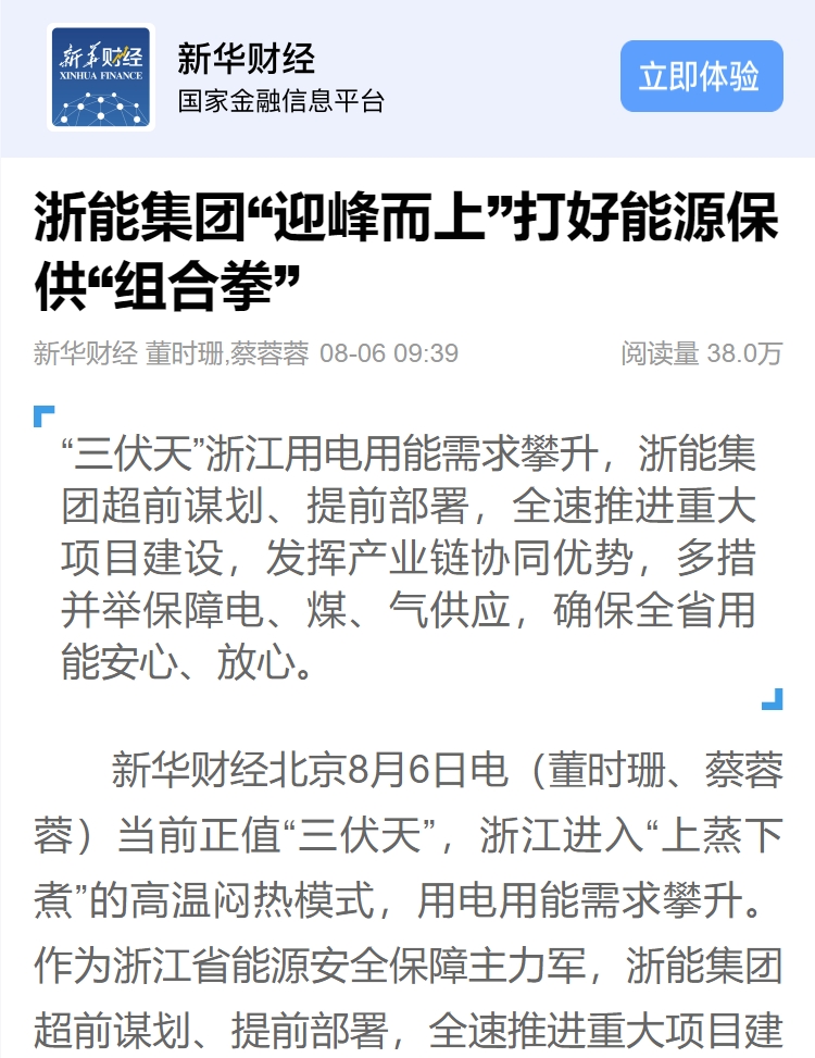 日前,新華(hua)社(she)刊登報道《打好迎峰度夏(xia)“組合拳” 浙能(neng)(neng)集團持續提(ti)升能(neng)(neng)源保供能(neng)(neng)力》,截至目(mu)前文章點擊量破(po)百(bai)萬。