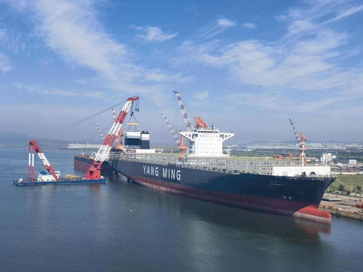 浙(zhe)能邁領公司在船廠為船東吊裝(zhuang)脫硫塔(ta)裝(zhuang)置。 浙(zhe)能邁領 提供