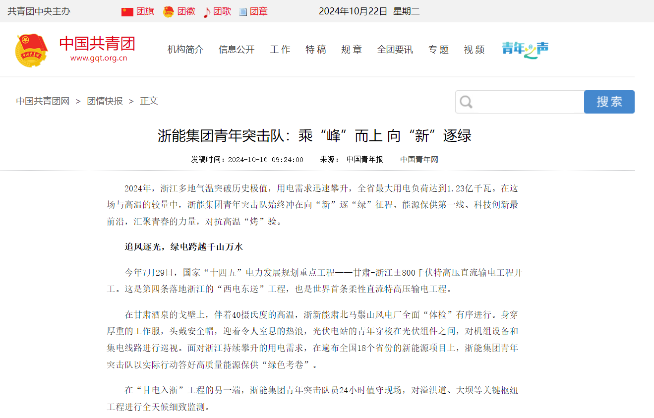 編者按:浙能(neng)集團(tuan)(tuan)青(qing)年(nian)(nian)突(tu)(tu)擊(ji)隊在2024年(nian)(nian)浙江多地氣溫突(tu)(tu)破歷史極(ji)值、用(yong)電需求(qiu)迅(xun)速攀升的情況下,始終沖在向“新”逐“綠”征程、能(neng)源保供第一線、科技創新最前沿(yan),匯聚青(qing)春的力(li)量,對抗高溫“烤(kao)”驗”。10月16日,中國青(qing)年(nian)(nian)報、共青(qing)團(tuan)(tuan)中央官網(wang)等平臺刊(kan)發《浙能(neng)集團(tuan)(tuan)青(qing)年(nian)(nian)突(tu)(tu)擊(ji)隊:乘“峰”而上 向“新”逐綠》,聚焦浙能(neng)青(qing)春力(li)量。