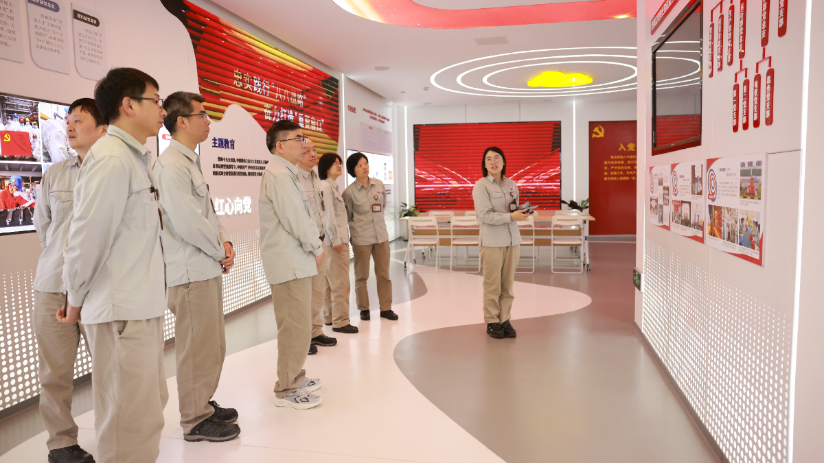 樂電公司黨員在(zai)企業展廳聆聽(ting)發展故事,感受澎湃動能。 陳(chen)清瑜 攝