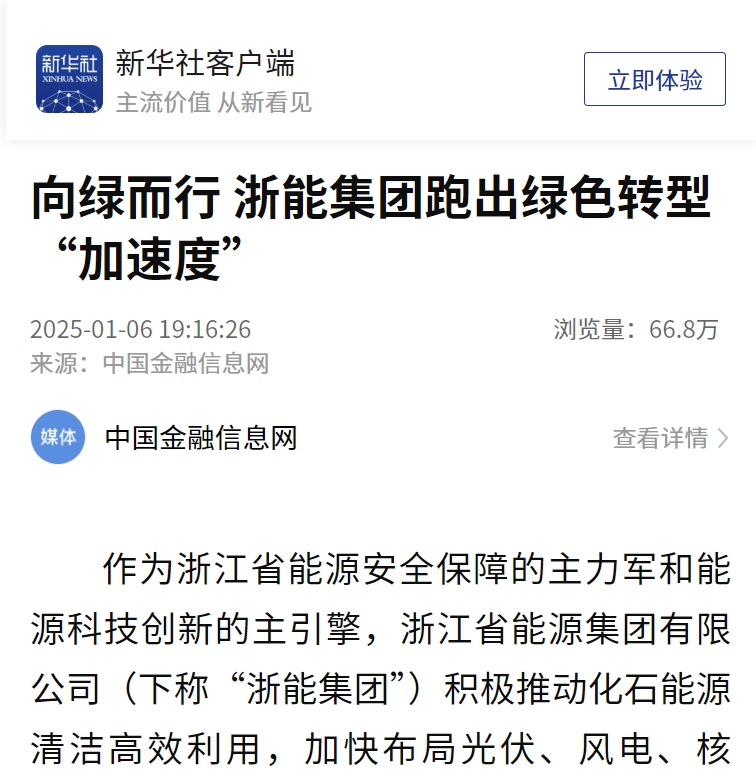 近日(ri),新華社推(tui)出浙(zhe)(zhe)能(neng)集(ji)團高(gao)質(zhi)量發展主(zhu)題系列報(bao)道,并于1月6日(ri)刊發《向綠而(er)行 浙(zhe)(zhe)能(neng)集(ji)團跑出綠色轉型“加速度(du)”》。