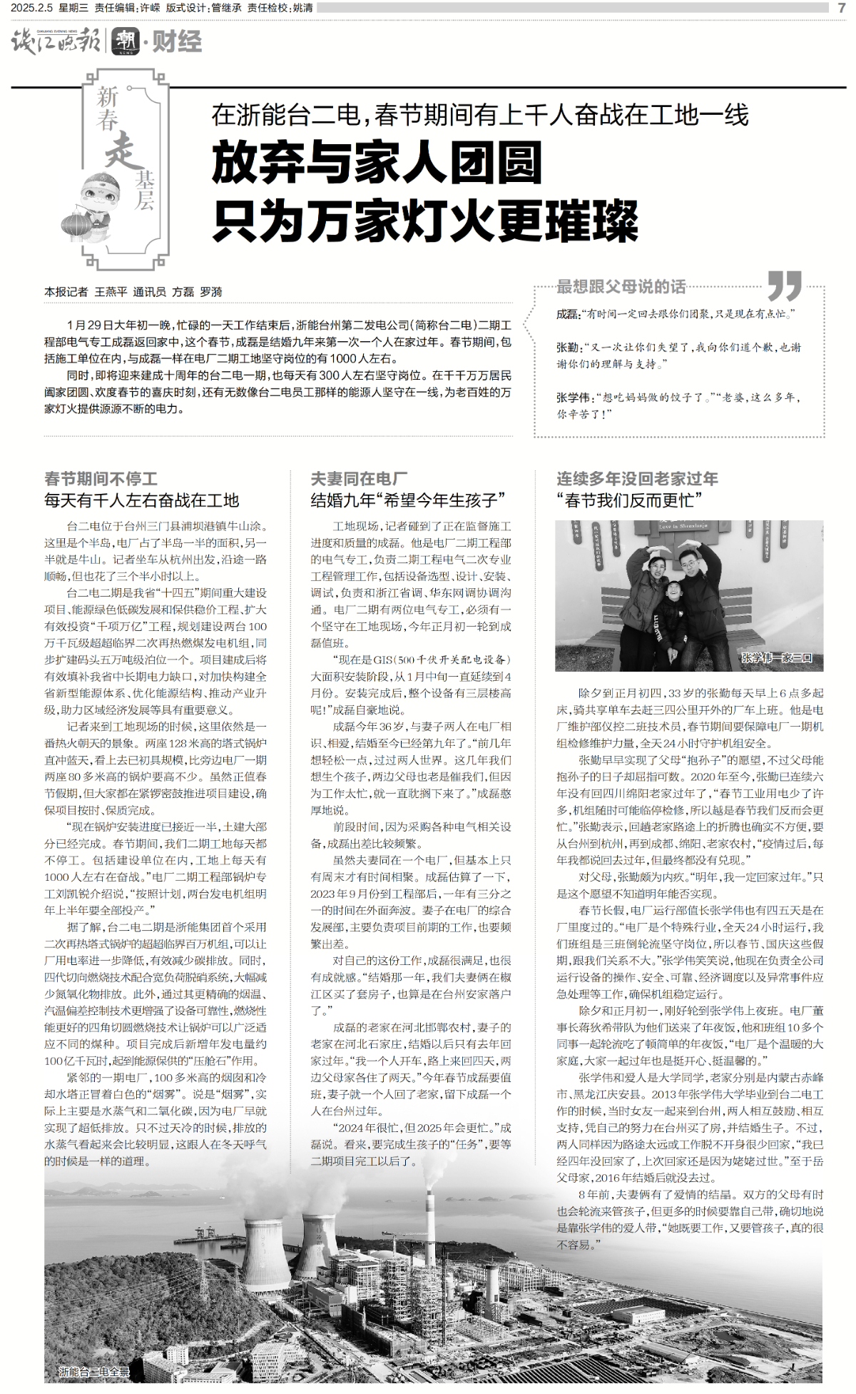 2月5日(ri),錢(qian)江(jiang)晚(wan)報整版(ban)報道《在浙能(neng)臺二電,春節期間有上千人奮戰在工(gong)地一線 放棄與(yu)家(jia)人團(tuan)圓 只為萬家(jia)燈(deng)火更璀璨》。 錢(qian)江(jiang)晚(wan)報 圖(tu)