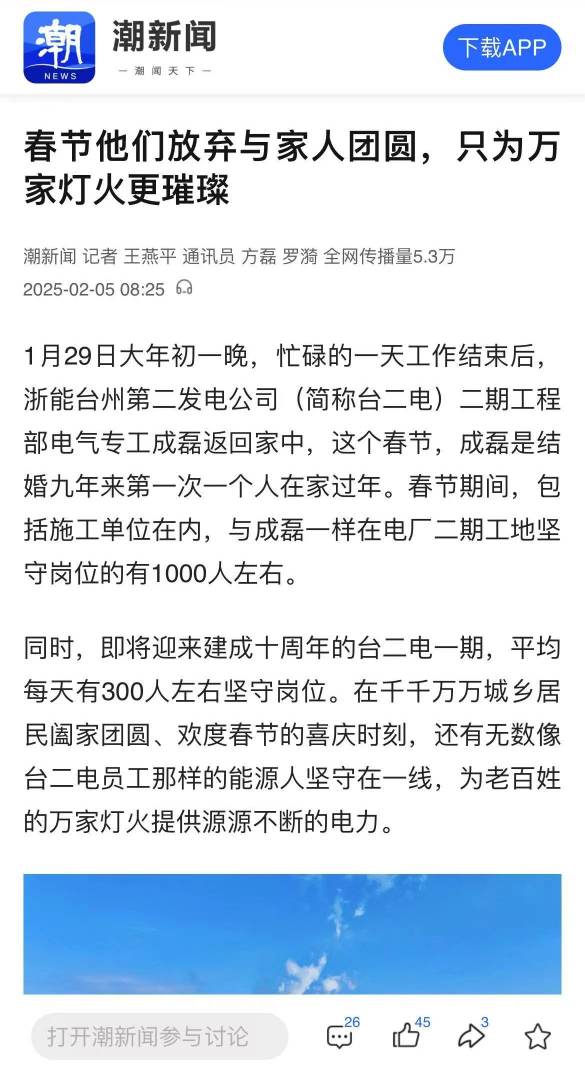編者按:春(chun)節(jie),是(shi)闔(he)家團圓的(de)(de)日(ri)子(zi),是(shi)歡(huan)聲(sheng)笑語的(de)(de)時刻。然而,在這萬家燈火的(de)(de)背后,有(you)一群浙能人,他們放棄(qi)了與(yu)家人團聚的(de)(de)溫馨,選擇堅守崗位,用(yong)責任(ren)和擔當(dang)守護(hu)著節(jie)日(ri)的(de)(de)溫暖與(yu)光明。2月5日(ri),《錢(qian)江晚報》整版報道浙能臺二電春(chun)節(jie)期間上千人奮戰在工(gong)地一線。
