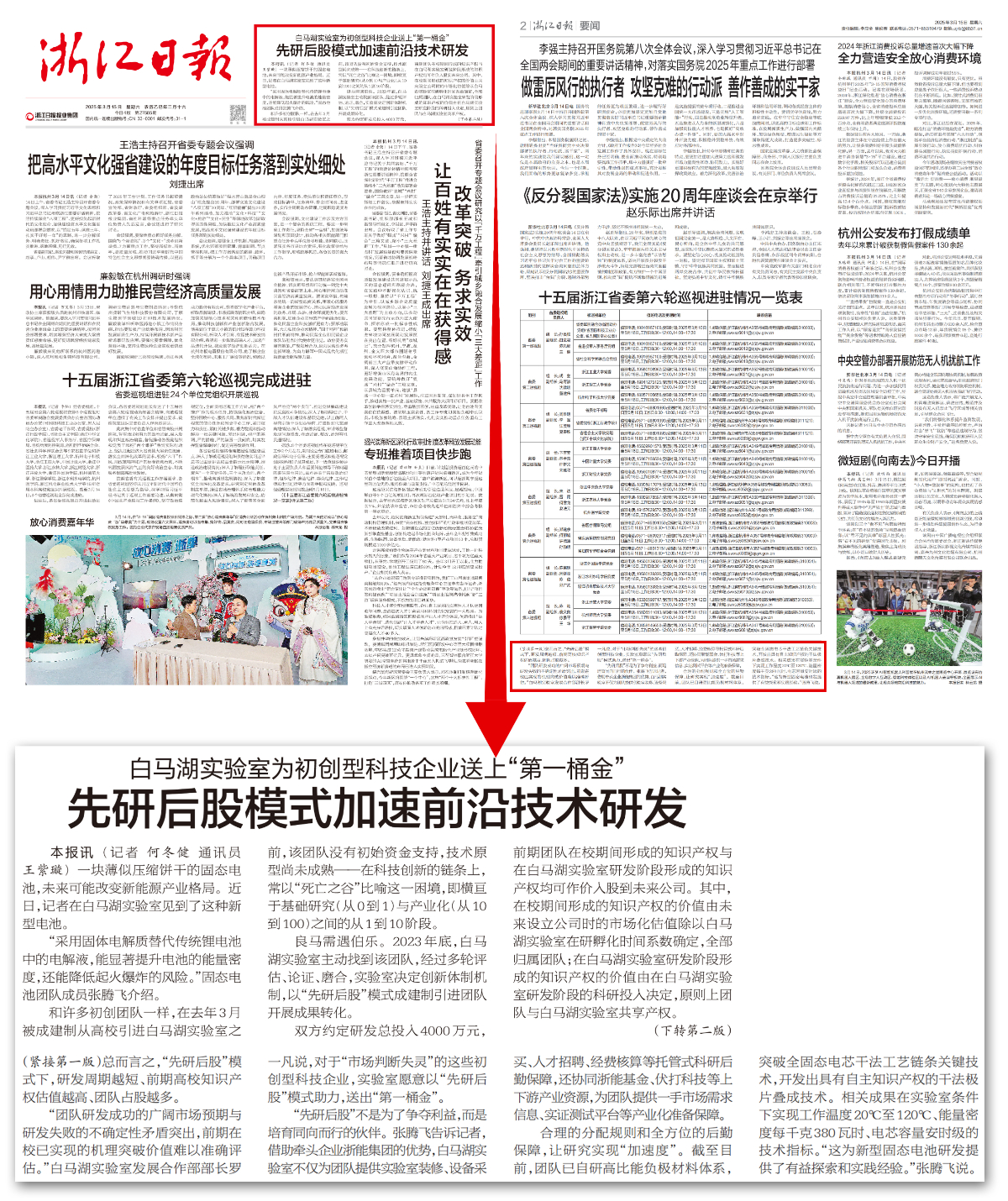 《浙江日報(bao)》3月15日頭版報(bao)眼(yan)報(bao)道白(bai)馬湖(hu)實驗室為初創型科技(ji)企業送上“第一桶金(jin)”,先研后(hou)股(gu)模式加速前沿(yan)技(ji)術研發(fa)。