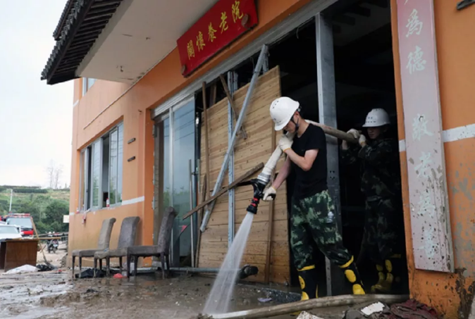 面對這一情況,浙能志愿者們立即投入緊張的救援工作中。他們接通周邊河水管路,開啟水泵對養老院外側道路以及內部房間的泥沙進行沖洗。頂著烈日與刺鼻的異味,志愿者們絲毫沒有畏難情緒,全心投入到救援工作中。至傍晚18時許,在他們的不懈努力下,終于將養老院一樓泥沙清理完成,也成功恢復養老院通往外界道路的暢通。