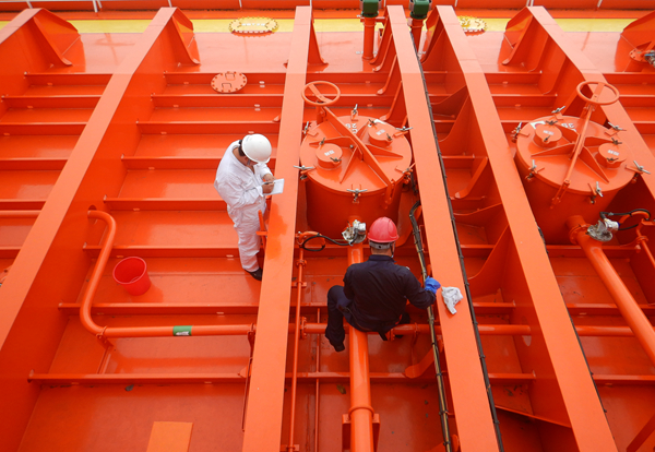 ▲ “浙能油1”輪與碼頭方在船舶卸油前進行量油檢測。