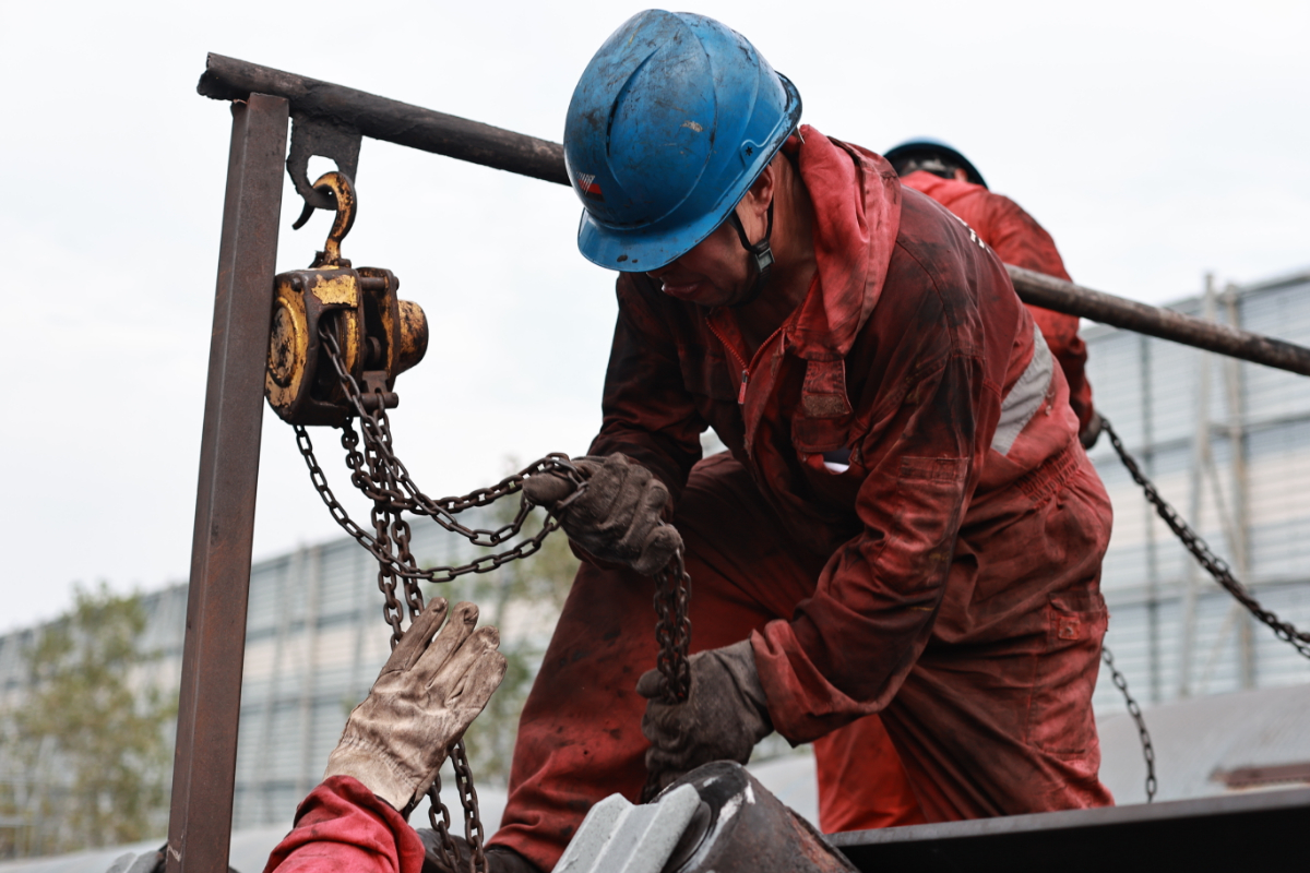 浙能港口公司(si)檢修員在使用手拉葫蘆輔助作業。 陳宇 攝(she)
