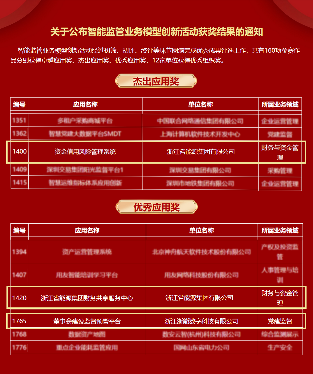 近日,國(guo)務院國(guo)資委(wei)2023年智能監(jian)管業務模(mo)型創新活動獲(huo)獎名單揭(jie)曉,浙(zhe)能集(ji)團(tuan)《資金信用風險管理(li)系統》榮獲(huo)“杰出(chu)應(ying)(ying)用獎”,《財務共享服務中心》《董事(shi)會(hui)建設監(jian)督預(yu)警平臺(tai)》榮獲(huo)“優秀應(ying)(ying)用獎”。