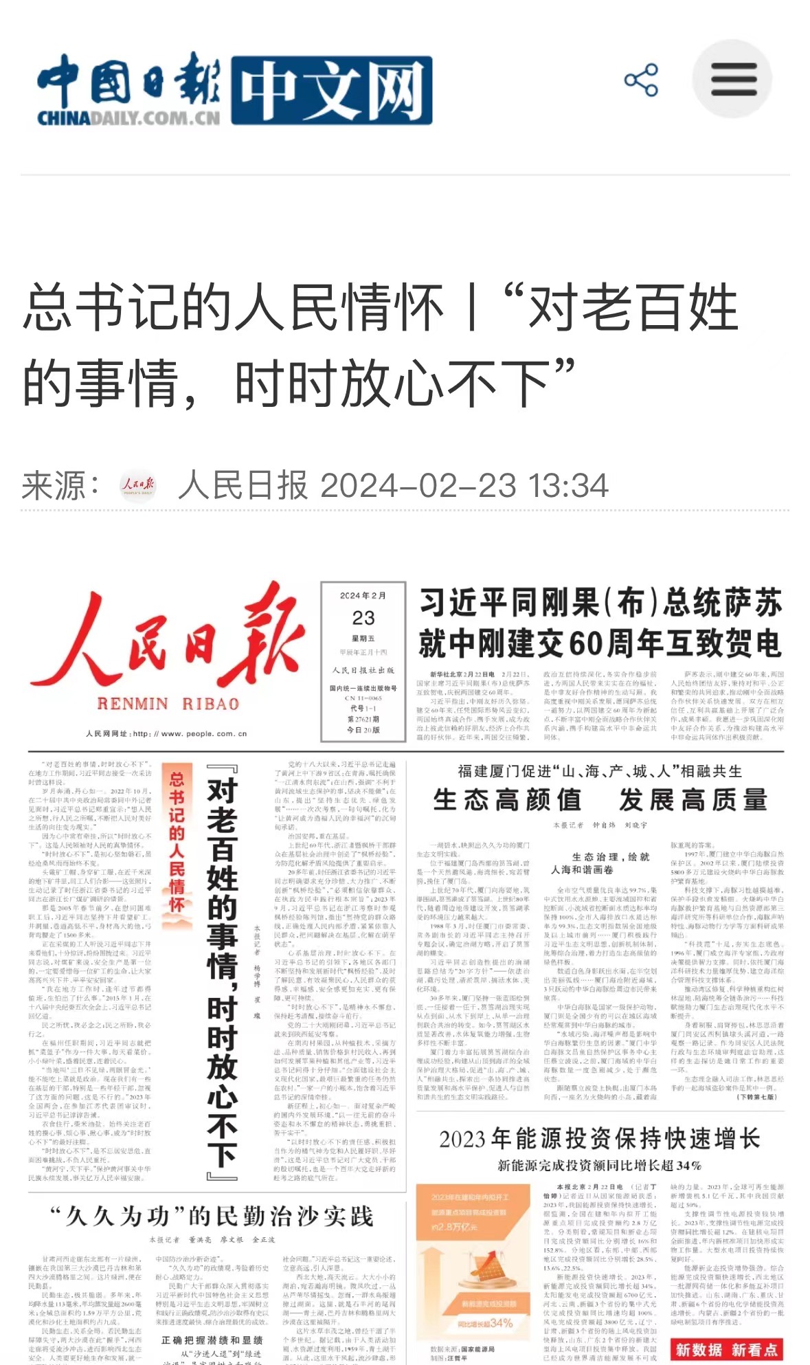 2月23日(ri)(ri),中(zhong)國日(ri)(ri)報轉(zhuan)載《人(ren)民(min)日(ri)(ri)報》頭(tou)版頭(tou)條文章《總書記(ji)的人(ren)民(min)情懷》。 中(zhong)國日(ri)(ri)報 提供