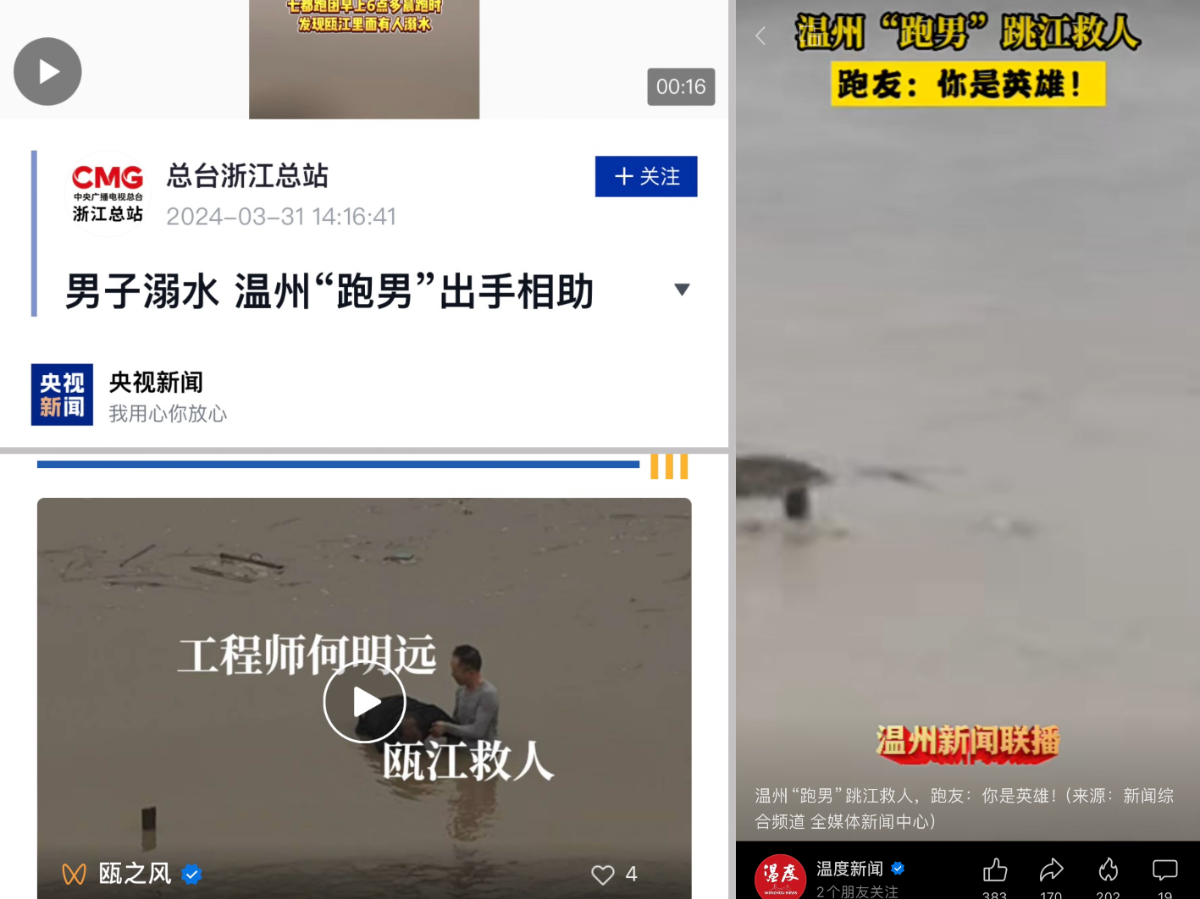 媒體(ti)報道浙能職工奮(fen)不顧身救下溺水者。 各媒體(ti) 圖