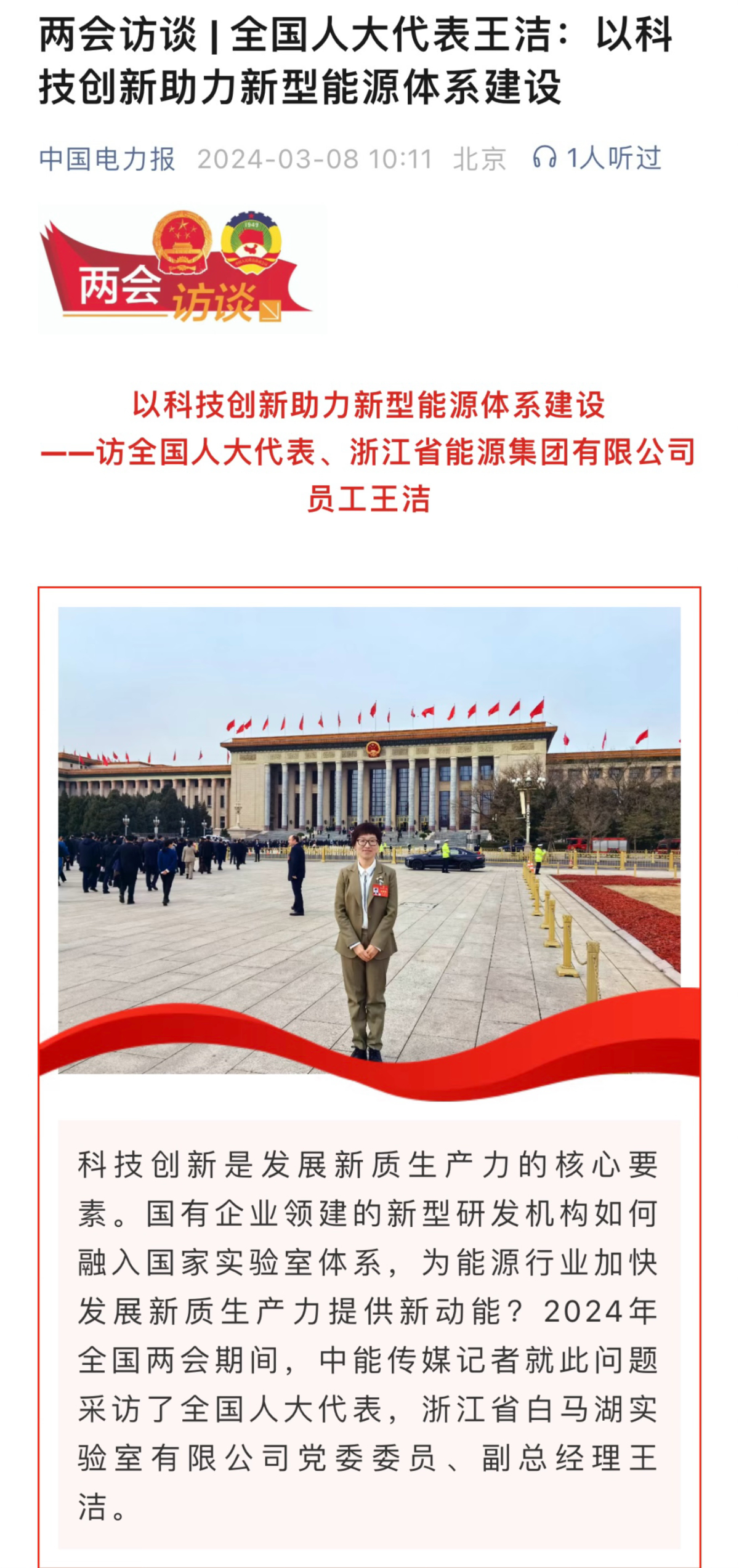 中國(guo)電(dian)力報報道《兩會訪談(tan) | 全(quan)國(guo)人大代表(biao)王潔:以科技創(chuang)新助力新型能源(yuan)體(ti)系建(jian)設》。 中國(guo)電(dian)力報 圖