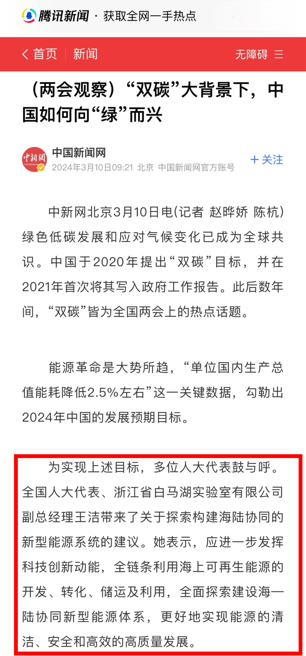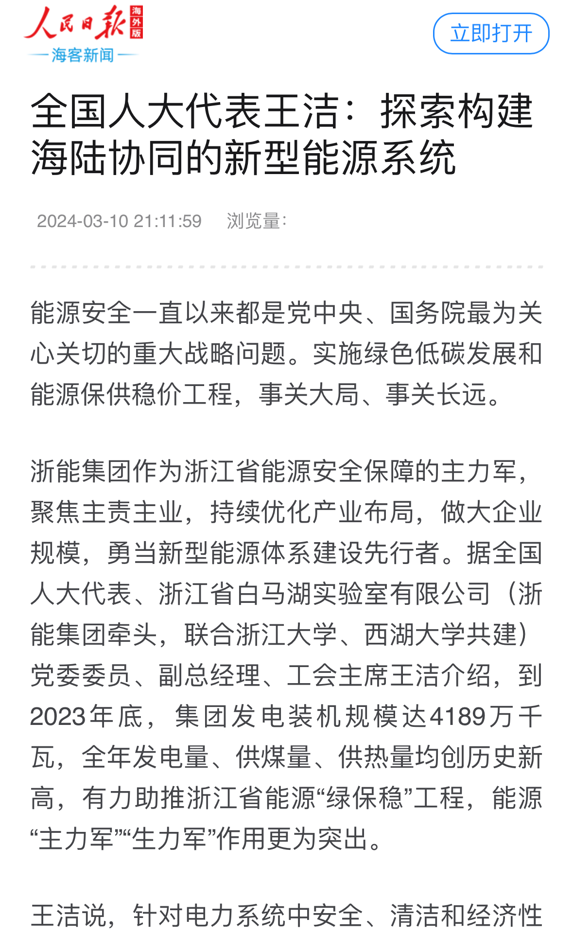 人民日報(bao)海(hai)外版官網報(bao)道《全國人大代表(biao)王(wang)潔:探(tan)索構建海(hai)陸協同的新型能源系統》。 人民日報(bao)海(hai)外版官網 圖