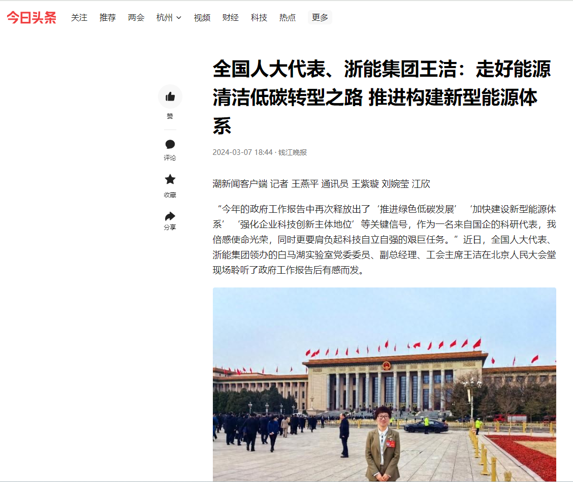 今日頭條報道《全國人大代(dai)表、浙能集團王潔(jie):走(zou)好能源(yuan)(yuan)清潔(jie)低碳轉型之路 推進構建新(xin)型能源(yuan)(yuan)體系》。 今日頭條 圖